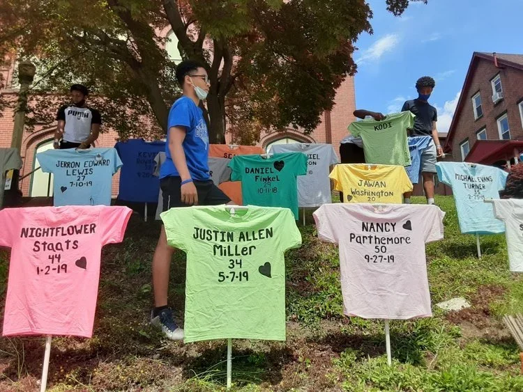 We are encouraging walkers to carry a T-shirt stand from the Memorial on the Walk. Walkers may also carry signs. The shirts will be moved to Zwingli UCC.